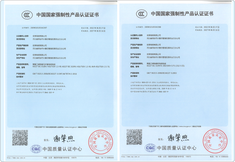 聚录乙烯绝缘无护套电缆电线证书